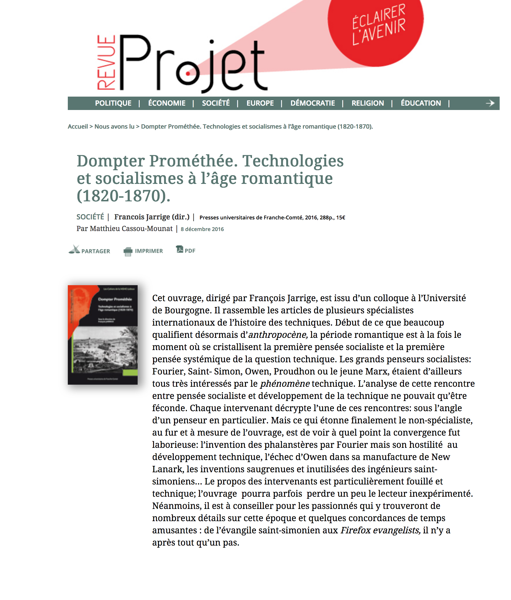 François Jarrige est maître de conférences HDR en histoire contemporaine à l’université de Bourgogne et membre du LIR3S (UMR 7366 CNRS-uB). Il explore l’histoire des techniques, des mondes du travail et des réformateurs sociaux au xixe siècle.
