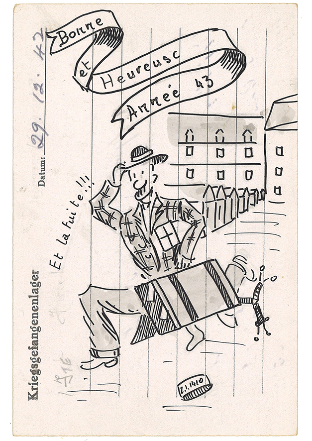 AD. Non, c'étaient des gens qui venaient parfois de Bretagne, d’Angleterre, voire d’Amérique. On savait juste qu'ils étaient au 60. On aurait pu correspondre plus tard avec ces gens, mais ça ne se faisait pas à l'époque. On évitait de sortir. Il y avait eu juste un prisonnier qui était directeur des pompes funèbres à Dole et qui nous avait invitées toutes les trois [Mme Decreux-Biaudet avait deux sœurs, Lucienne et Suzanne] à Dole [sur l'un des dessins, est écrit Notre liberté reviendra en compagnie de notre ami Pennot, et on se rendra avenue Georges Clemenceau pour remercier ce petit bistrot qui nous fait de si bons cadeaux.] [...] Ils avaient faim pendant la guerre. Nous aussi, on avait faim.
