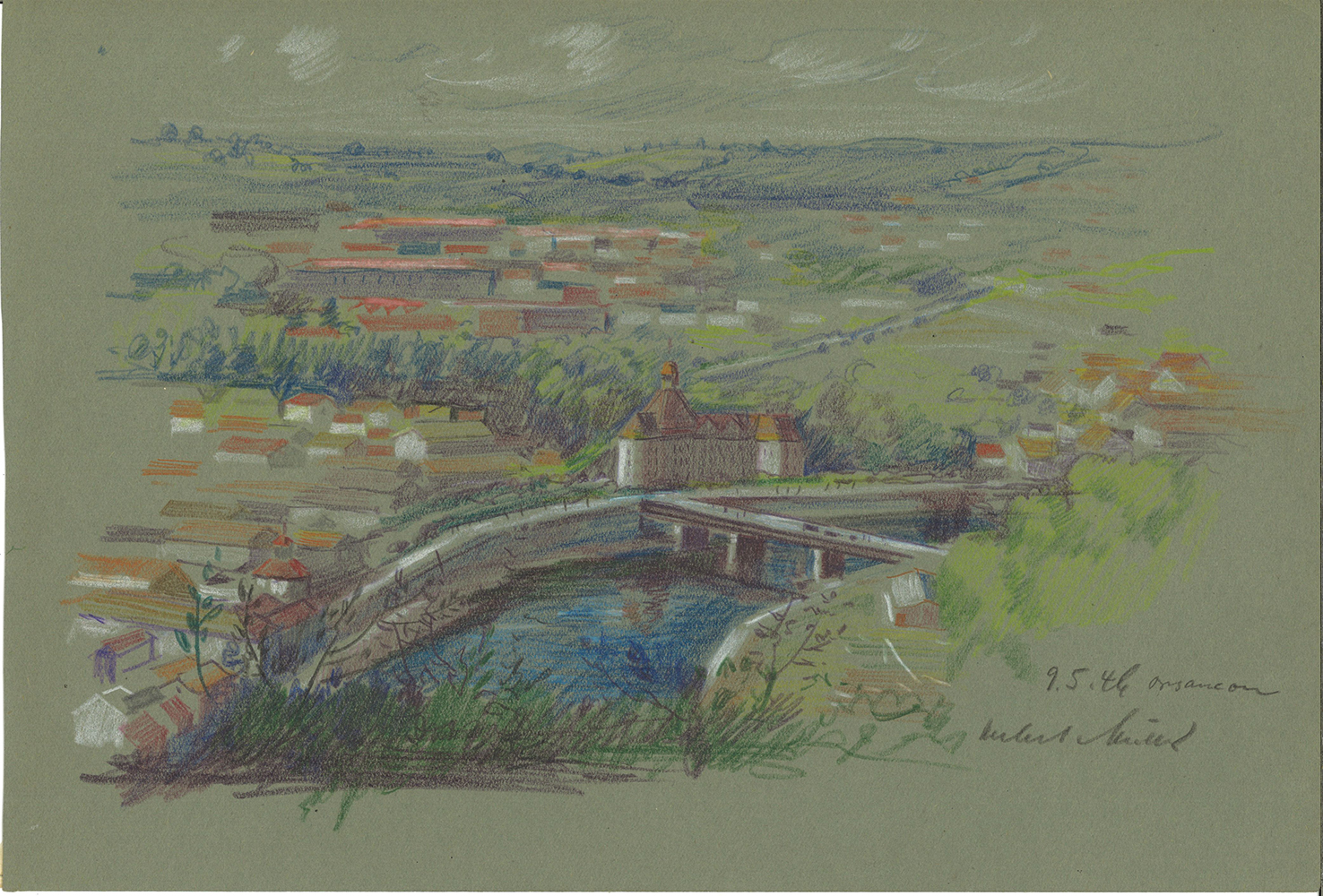 Le prisonnier semble aussi, parfois, embellir ce qu’il voit. Sa vue de Besançon du 9 mai 1946 montre une ville qui n’a en rien souffert de la guerre, alors qu’en réalité le pont visible au premier plan a été détruit deux fois. Peut-être cet embellissement l’aide à s’évader mentalement de sa condition, ou effacer les traces de la guerre.