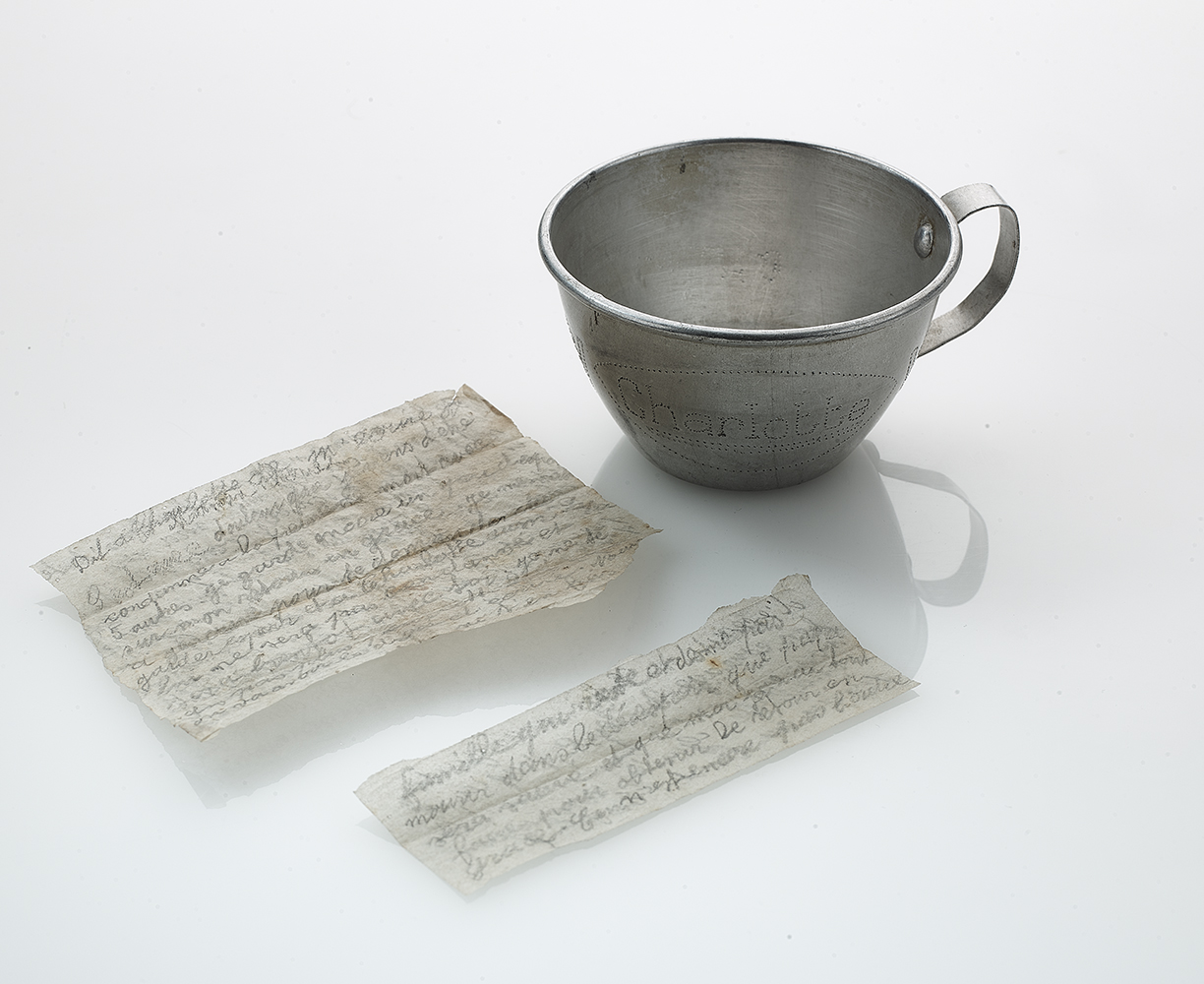 Für die Gefangenen war es schwer, auch nur irgendetwas zu besitzen, denn sie wurden bei ihrer Ankunft der meisten Dinge, die sie bei sich trugen, beraubt. Durch Improvisation schafften es diese drei Gefangenen der Résistance, während ihrer Gefangenschaft Objekte anzufertigen und zu gestalten. Colette Zingg (1908-2007) war eine Widerstandskämpferin aus der Franche-Comté, die am 13. Juni 1942 verhaftet und im Gefängnis des Stadtteils Butte interniert wurde. Dort fertigte sie aus Teilen ihrer Häftlingsdecke ein Handtäschchen mit ihren Initialen an. Philippe de Vomécourt (1902-1964) war Agent des britischen Geheimdienstes SOE, er wurde am 12. November 1942 verhaftet und dann im Gefängnis Saint-Paul in Lyon inhaftiert, in dem er bis Juli 1943 blieb und ein Modell seiner Zelle anfertigte. Dieses ist aus Teedosen gefertigt und zeigt erstaunlich viele Details. Robert Chanut (1924-2016) wurde am 14. Februar 1944 von der Lyoner Gestapo verhaftet. Er war zwischen dem 15. und 26. Februar im Gefängnis Fort Montluc in Lyon inhaftiert. Die Haftbedingungen waren extrem. Er beschloss daher, sich aus einem Stück Holzdiele und einer Rasierklinge, die er in den Baracken der jüdischen Häftlinge auf dem Boden gefunden hatte, einen Löffel herzustellen. All diese Objekte haben Gemeinsamkeiten: die Fertigung im schwierigen Kontext der Gefangenschaft, aber auch der Wille zu überleben und durch das künstlerisch-handwerkliche Gestalten Gedanken zu entfliehen. Die Objekte haben alle eine erstaunliche Geschichte und ermöglichen es, auf den Werdegang ihrer Besitzer aufmerksam zu machen.