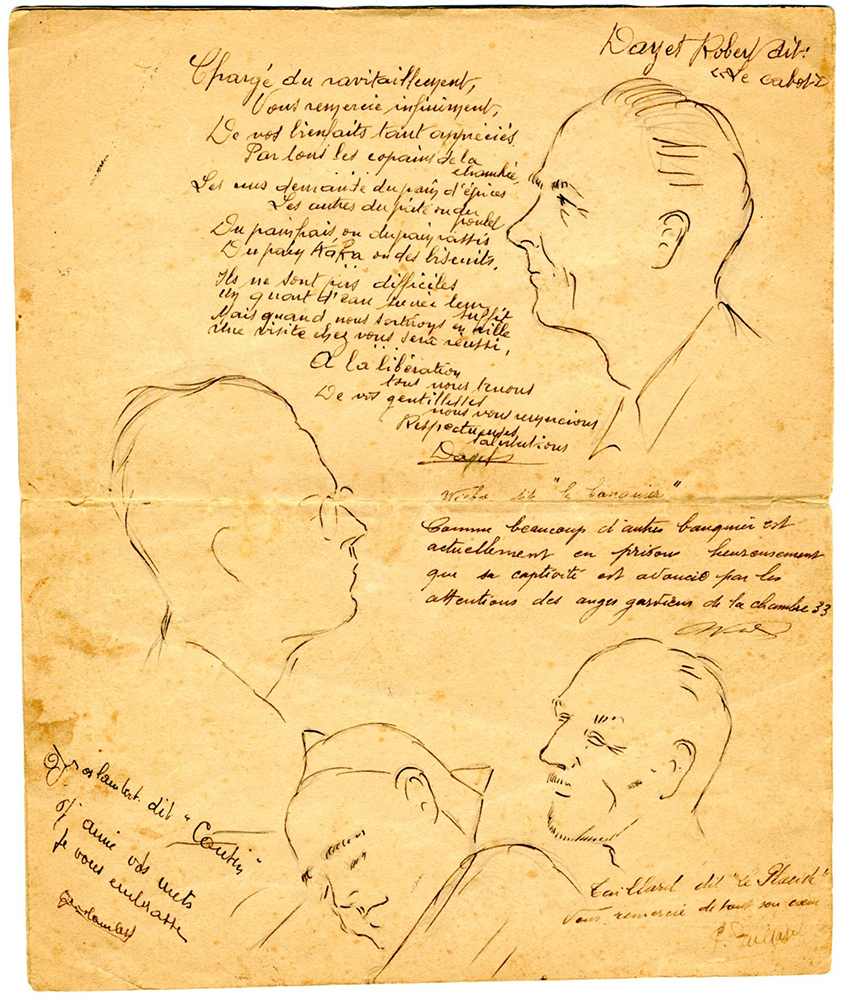 Dessins réalisés par une douzaine de prisonniers de la Caserne Vauban à Marcel et Blanche Biaudet. 6 pages, 14 portraits accompagnés de mots de remerciement.