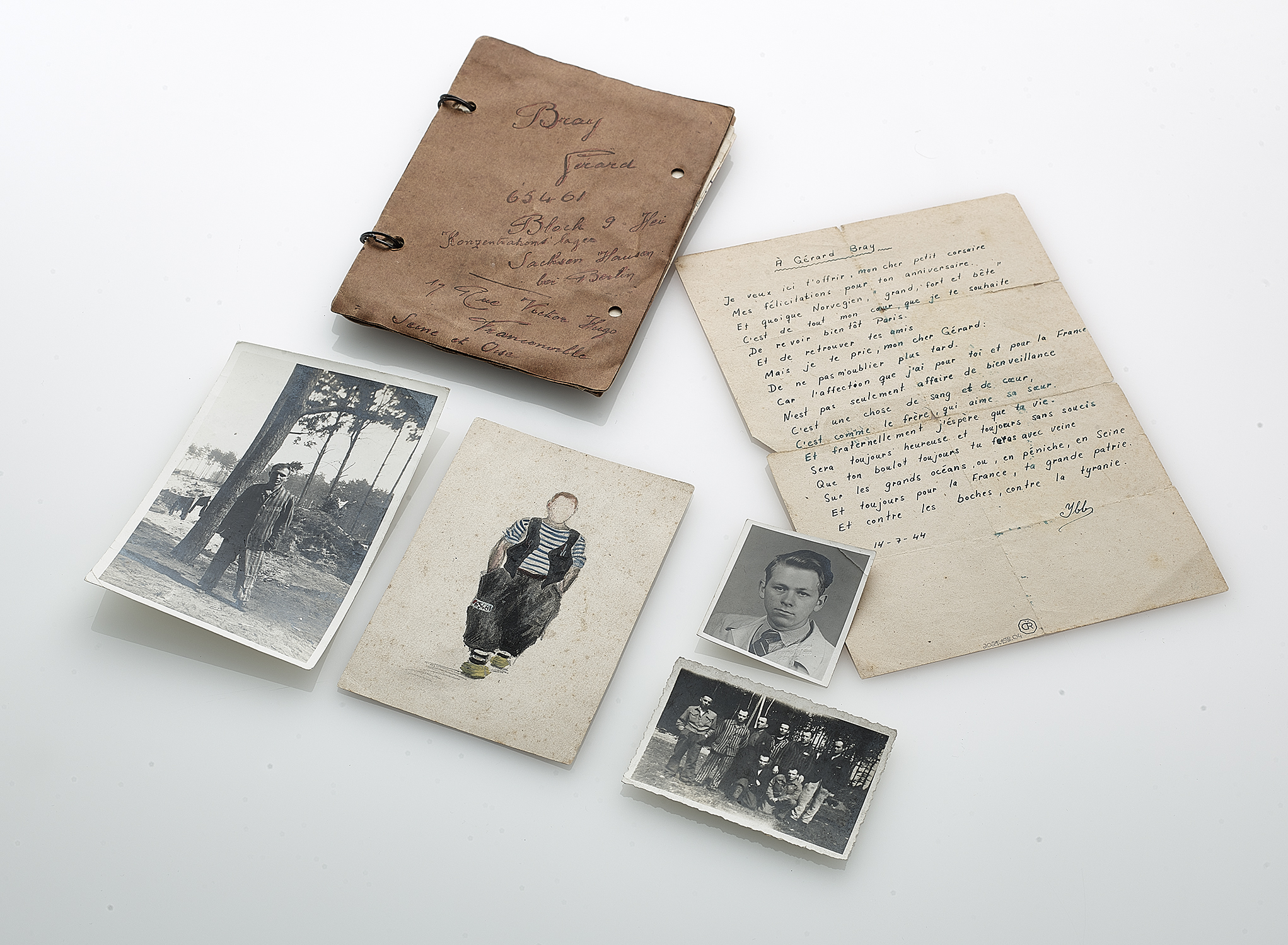 Né le 14 juillet 1923 à Paris, Gérard Bray voit son destin basculer l’année de ses 20 ans, en 1943, lorsqu’il tente de passer clandestinement en Espagne dans l’espoir de rejoindre l’Angleterre. Arrêté par la Feldgendarmerie, il est déporté en Allemagne le 28 avril 1943 à Oranienbourg-Sachsenhausen sous le matricule 65461. Considéré comme l’un des plus grands camps de concentration allemands entre 1936 et 1945, plus de 200 000 détenus y sont passés durant cette période. Les prisonniers sont forcés d’exécuter un travail très difficile pour les industries locales et les industries de guerre.